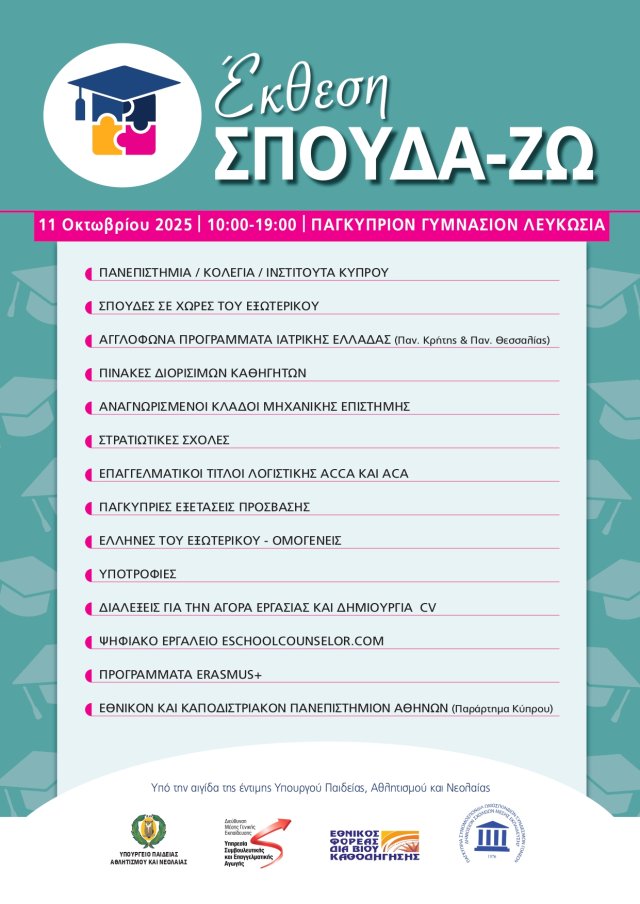 Η Υπηρεσία Συμβουλευτικής και Επαγγελματικής Αγωγής (ΥΣΕΑ) της Διεύθυνσης Μέσης Γενικής Εκπαίδευσης του ΥΠΑΝ, σε συνεργασία με την Παγκύπρια Συνομοσπονδία Ομοσπονδιών Συνδέσμων Γονέων Δημοσίων Σχολείων Μέσης Εκπαίδευσης διοργανώνει την Έκθεση «ΣΠΟΥΔΑ-ΖΩ 2025», στις 11 Οκτωβρίου 2025, στο Παγκύπριον Γυμνάσιον στη Λευκωσία (Πλατεία Αρχ. Κυπριανού, 1016, Λευκωσία), από τις 10:00– 19:00. Η Δράση τελεί υπό την αιγίδα της έντιμης Υπουργού Παιδείας, Αθλητισμού και Νεολαίας.